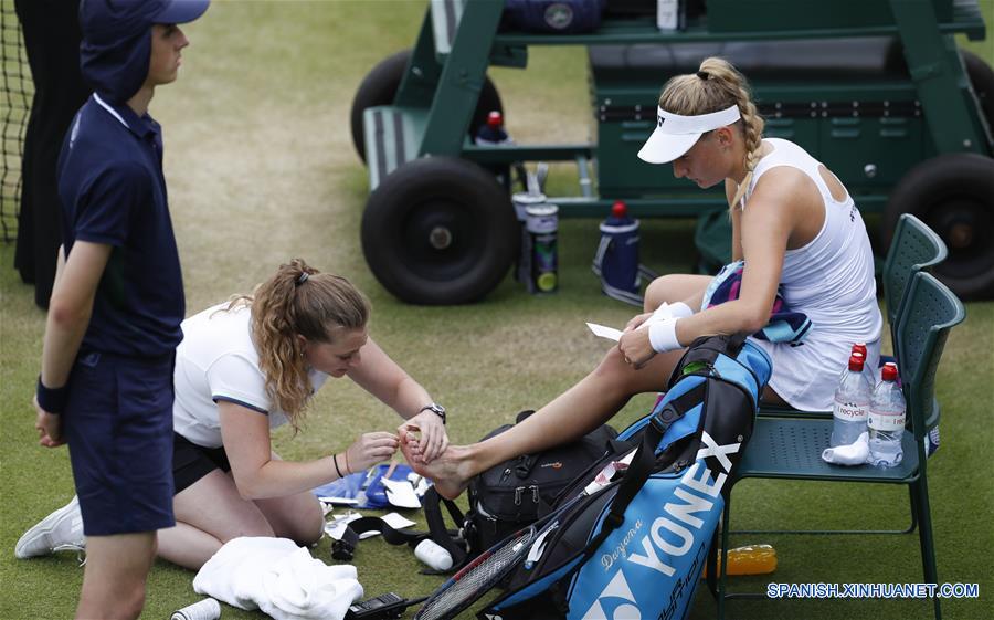 LONDRES, 8 julio, 2019 (Xinhua) -- Dayana Yastremska, de Ucrania, recibe tratamiento médico durante el partido individual femenil de cuarta ronda del Campeonato de Wimbledon 2019, ante Zhang Shuai, de China, en Londres, Reino Unido, el 8 de julio de 2019. (Xinhua/Han Yan)
