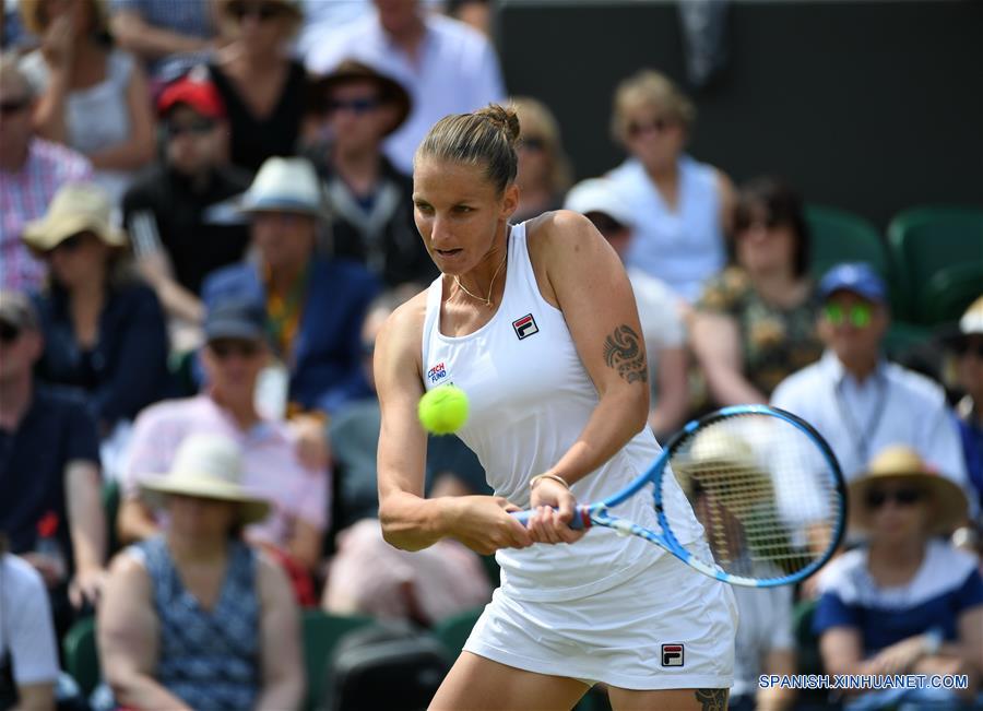 LONDRES, 8 julio, 2019 (Xinhua) -- Karolina Pliskova, de República Checa, devuelve la pelota a su compatriota Karolina Muchova, durante el partido individual femenil de la cuarta ronda del Campeonato de Wimbledon 2019, Reino Unido, el 8 de julio de 2019. (Xinhua/Lu Yang)