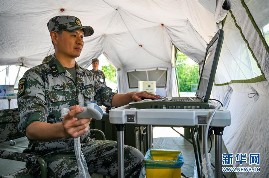 El 6 de julio, en la base militar de Feldkirchen, Alemania, miembros del equipo de apoyo médico militar de China utilizaron equipos de ultrasonido portátiles. (Foto: Lian Zhen)