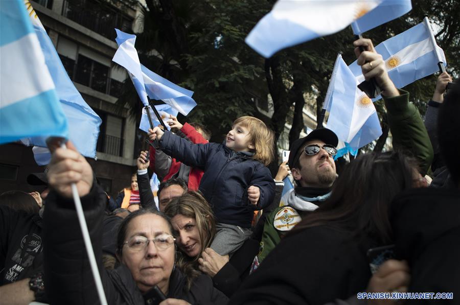 Residentes asisten al desfile militar en el marco de la conmemoración del Día de la Independencia, en la ciudad de Buenos Aires, capital de Argentina, el 9 de julio de 2019. El presidente de Argentina, Mauricio Macri, encabezó el martes en la ciudad norte?a de Tucumán el acto central por el Día de la Independencia, y luego asistió en Buenos Aires a un desfile militar con la presencia de cerca de 4.000 efectivos. (Xinhua/Martín Zabala)