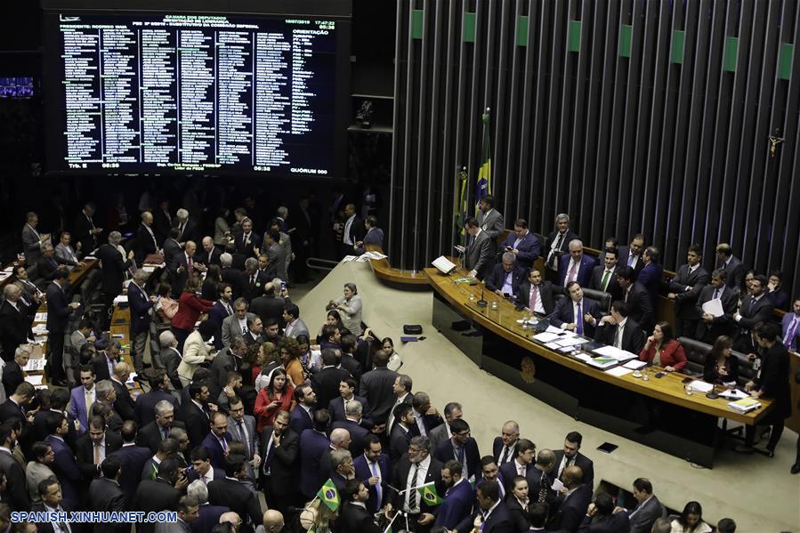 Diputados participan en la sesión plenaria para votar sobre la propuesta de reforma de pensiones, en la Cámara de Diputados, en Brasilia, Brasil, el 10 de julio de 2019. El presidente de la Cámara de Diputados de Brasil, Rodrigo Maia, consideró que habrá un margen "importante" de votos para aprobar la reforma de pensiones, al iniciar el miércoles la sesión plenaria para votar la propuesta. (Xinhua/Lucio Tavora)