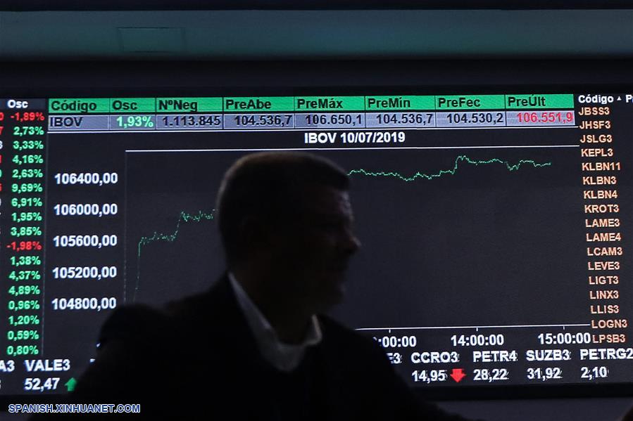 Un hombre camina frente a un cartel electrónico que muestra el comportamiento de la Bolsa de Valores de Sao Paulo, en el marco de la votación de la reforma de pensiones, en Sao Paulo, Brasil, el 10 de julio de 2019. El presidente de la Cámara de Diputados de Brasil, Rodrigo Maia, consideró que habrá un margen "importante" de votos para aprobar la reforma de pensiones, al iniciar el miércoles la sesión plenaria para votar la propuesta. (Xinhua/Rahel Patrasso)