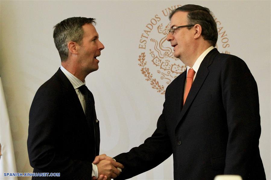 El secretario de Relaciones Exteriores mexicano, Marcelo Ebrard (d), y el director de Operaciones de la Corporación para la Inversión Privada en el Extranjero (OPIC, por sus siglas en inglés) de Estados Unidos, Ryan Brennan (i), participan durante la firma de la Carta de Intención con la OPIC, en la Ciudad de México, capital de México, el 10 de julio de 2019. Estados Unidos explorará financiar proyectos de desarrollo en el sur de México por unos 720 millones de dólares a través de su OPIC, informó el miércoles la cancillería mexicana. (Xinhua/Str)