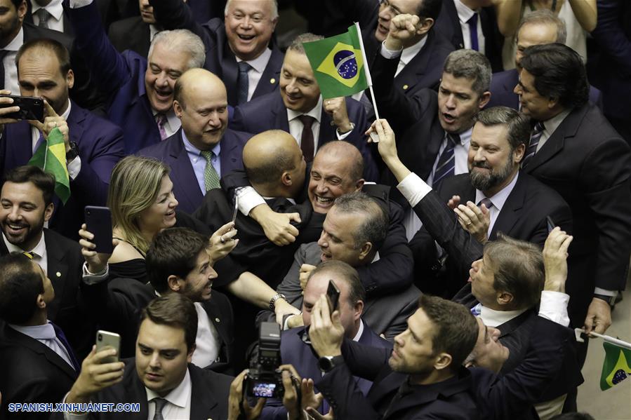 Representantes del gobierno celebran durante la sesión para votar sobre la propuesta de reforma de pensiones, en la Cámara de Diputados, en Brasilia, Brasil, el 10 de julio de 2019. El plenario de la Cámara de Diputados de Brasil aprobó el miércoles, en primera vuelta, el texto básico de la Propuesta de Enmienda Constitucional (PEC 6/2019) que altera el sistema de pensiones, presentada por el gobierno de Jair Bolsonaro. (Xinhua/Lucio Tavora)