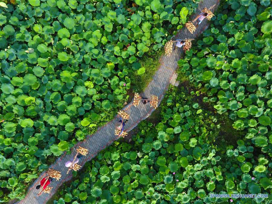 GUANGXI, 10 julio, 2019 (Xinhua) -- Vista aérea de agricultores cargando raíces de loto en un camino a un estanque de loto en la municipalidad de Baipeng del distrito de Liujiang, ciudad de Liujiang, en la Región Autónoma Zhuang de Guangxi, en el sur de China, el 10 de julio de 2019. (Xinhua/Huang Xiaobang)