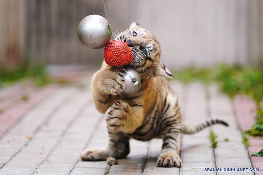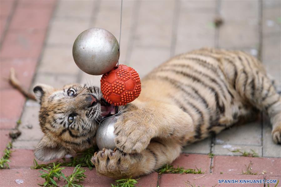 HEILONGJIANG, 13 julio, 2019 (Xinhua) -- Imagen del 12 de julio de 2019 de un cachorro de tigre siberiano jugando con pelotas en el parque de tigres siberianos del Centro de Crianza Felina Hengdaohezi de China, en Hailin, en la provincia de Heilongjiang, en el noreste de China. Más de 30 cachorros de tigres siberianos nacieron en el parque desde finales de febrero de este a?o. (Xinhua/Wang Jianwei)