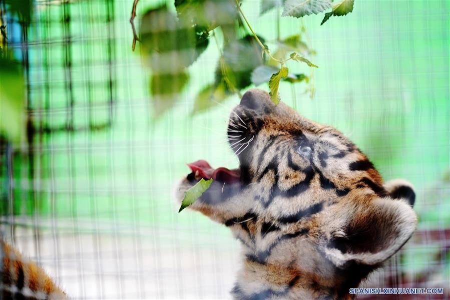Imagen del 12 de julio de 2019 de un cachorro de tigre siberiano mordiendo las hojas de un árbol en el parque de tigres siberianos del Centro de Crianza Felina Hengdaohezi de China, en Hailin, en la provincia de Heilongjiang, en el noreste de China. Más de 30 cachorros de tigres siberianos nacieron en el parque desde finales de febrero de este a?o. (Xinhua/Wang Jianwei)