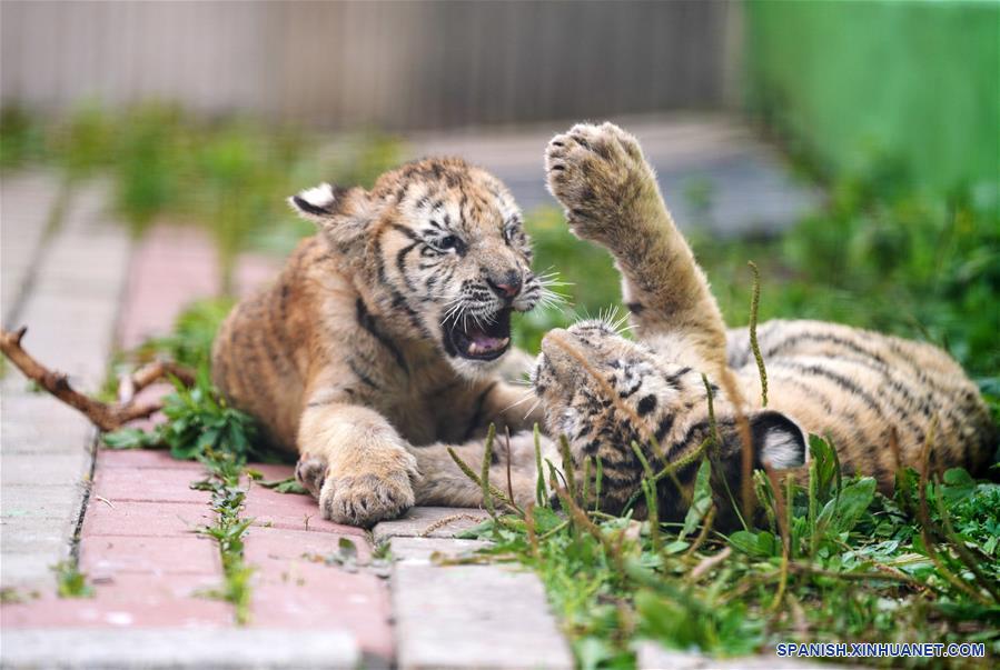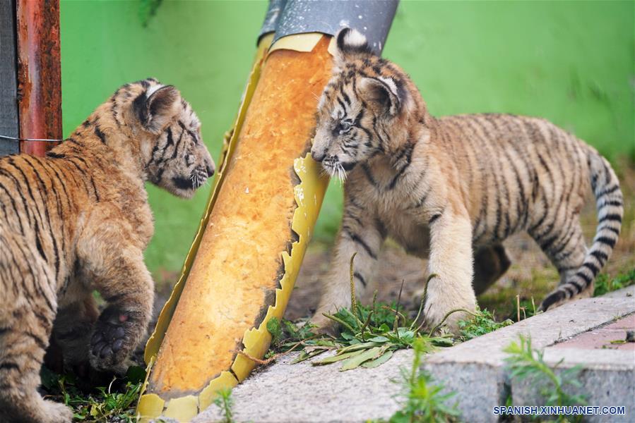 Imagen del 12 de julio de 2019 de cachorros de tigre siberiano jugando en el parque de tigres siberianos del Centro de Crianza Felina Hengdaohezi de China, en Hailin, en la provincia de Heilongjiang, en el noreste de China. Más de 30 cachorros de tigres siberianos nacieron en el parque desde finales de febrero de este a?o. (Xinhua/Wang Jianwei)