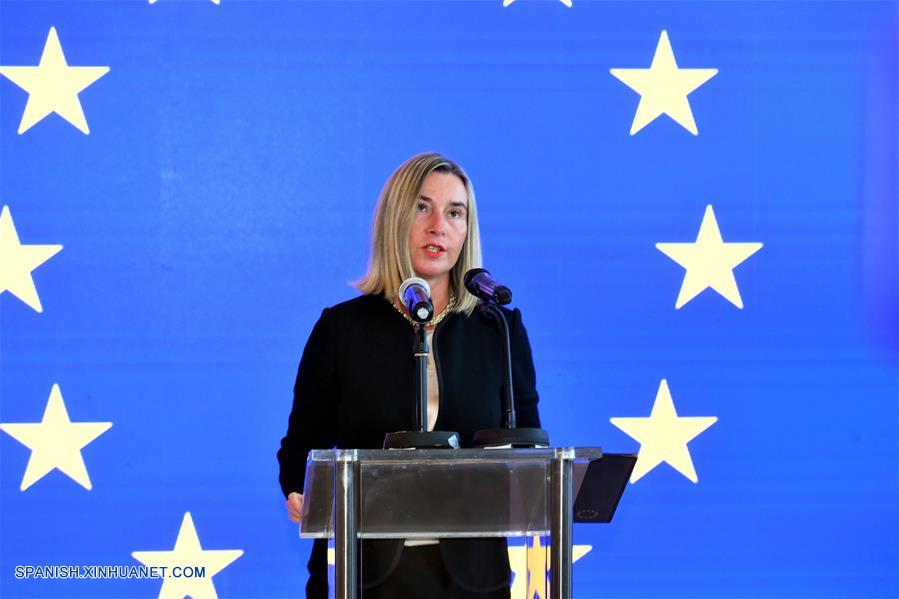 La alta representante de la Unión Europea (UE) para Asuntos Exteriores y Política de Seguridad, Federica Mogherini, pronuncia un discurso durante la ceremonia de apertura de la sede de la UE, en la Ciudad de Kuwait, Kuwait, el 14 de julio de 2019. La UE abrió el domingo la sede de su misión en Kuwait. En la ceremonia de apertura, el jeque Sabah Khaled Al-Hamad Al-Sabah, viceprimer ministro y ministro de Relaciones Exteriores de Kuwait, dijo que la delegación de la UE en el país constituye la culminación de la exitosa cooperación entre las dos partes. (Xinhua/Str)