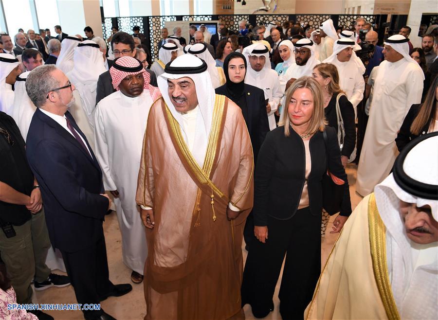 El jeque Sabah Khaled Al-Hamad Al-Sabah (i-frente), viceprimer ministro y ministro de Relaciones Exteriores de Kuwait, y la alta representante de la Unión Europea (UE) para Asuntos Exteriores y Política de Seguridad, Federica Mogherini (d-frente), asisten a la ceremonia de apertura de la sede de la UE, en la Ciudad de Kuwait, Kuwait, el 14 de julio de 2019. La UE abrió el domingo la sede de su misión en Kuwait. En la ceremonia de apertura, el jeque Sabah Khaled Al-Hamad Al-Sabah, viceprimer ministro y ministro de Relaciones Exteriores de Kuwait, dijo que la delegación de la UE en el país constituye la culminación de la exitosa cooperación entre las dos partes. (Xinhua/Str)