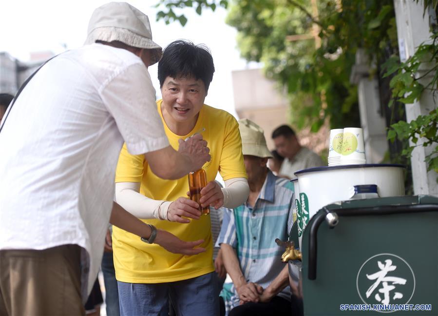 ZHEJIANG, 14 julio, 2019 (Xinhua) -- Un voluntario sirve bebidas en el puesto de té de hierbas gratuito de Gu Zhonggen, en el distrito de Shangcheng de Hangzhou, capital de la provincia de Zhejiang, en el este de China, el 14 de julio de 2019. Gu Zhonggen, de 81 a?os, instaló un puesto de té de hierbas cerca de una parada de autobús hace 42 a?os para ofrecer té gratuito durante el verano. (Xinhua/Han Chuanhao)