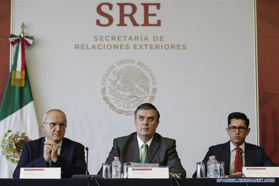 El secretario de Relaciones Exteriores, Marcelo Ebrard (c), participa en una conferencia de prensa, en la Ciudad de México, capital de México, el 15 de julio de 2019. México no coincide con las medidas que limitan el acceso de asilo en Estados Unidos a personas que lo soliciten tras cruzar la frontera común, informó el lunes Ebrard. (Xinhua/Francisco Ca?edo)