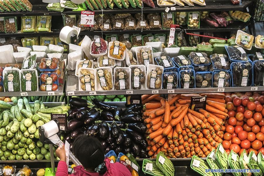 Vegetales son exhibidos para venta en un supermercado, en Sao Paulo, Brasil, el 15 de julio de 2019. Los analistas del mercado financiero de Brasil redujeron de 0,82 a 0,81 por ciento la previsión de crecimiento del producto interno bruto (PIB) para 2019, una nueva baja consecutiva, informó el lunes el Banco Central (BC). (Xinhua/Rahel Patrasso)