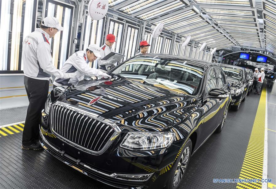 CHANGCHUN, 15 julio, 2019 (Xinhua) -- Imagen del 9 de abril de 2019 de empleados revisando automóviles de la marca Hongqi de FAW en un taller de ensamblaje en Changchun, capital de la provincia de Jilin, en el noreste de China. El producto interno bruto (PIB) de China se incrementó un 6,3 por ciento interanual en la primera mitad de 2019 para situarse en 45,09 billones de yuanes (unos 6,6 billones de dólares), mostraron el lunes los datos del Buró Nacional de Estadísticas (BNE). El crecimiento estuvo en consonancia con el objetivo anual del gobierno para 2019, establecido entre el 6 y el 6,5 por ciento. El PIB del país aumentó un 6,2 por ciento interanual en el segundo trimestre, por debajo del 6,4 por ciento del primer trimestre, según los datos oficiales. (Xinhua/Xu Chang)