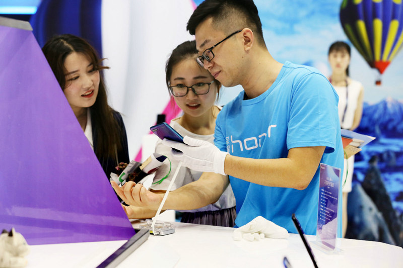 Un empleado de Huawei presenta los teléfonos inteligentes Honor de la compa?ía en una exposición de la industria en Beijing. [Foto: China Daily/A Jing]