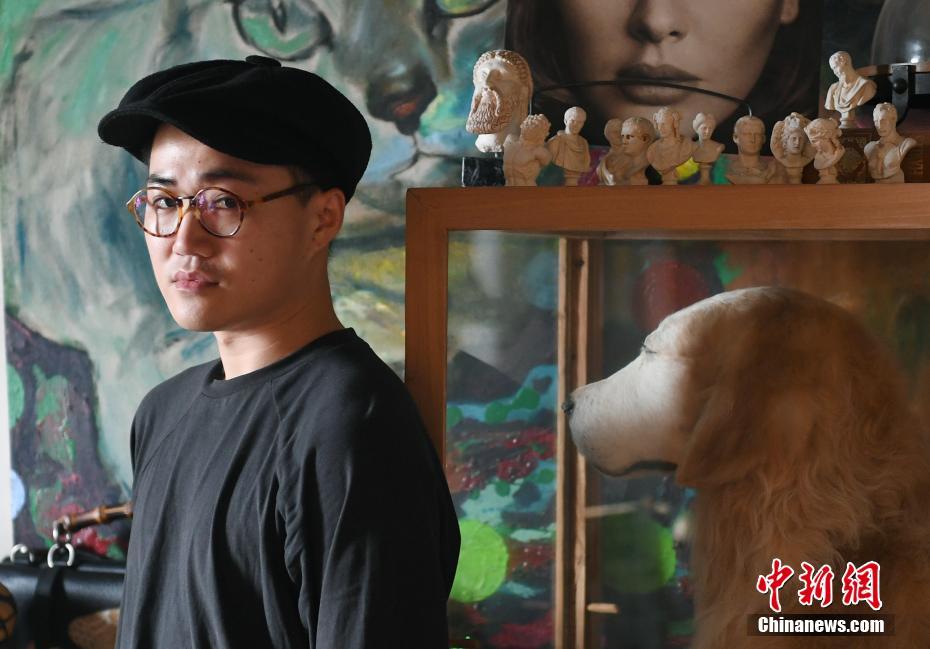 Beijing, 17/07/2019 (El Pueblo en Línea) - El 15 de julio, foto de Li Zhangda y el espécimen de su perro. Li elabora especímenes de mascotas en Hangzhou, provincia de Zhejiang. En los últimos a?os, Li ha prolongado de esta manera el cari?o y el acompa?amiento que diez mascotas ofrecían a sus due?os creando especímenes. (Foto: Wang Gang)