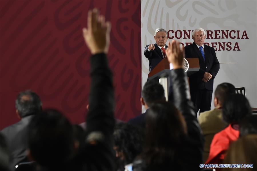 CIUDAD DE MEXICO, 17 julio, 2019 (Xinhua) -- El presidente de México, Andrés Manuel López Obrador (i-atrás), participa en una rueda de prensa en Palacio Nacional, en la Ciudad de México, capital de México, el 17 de julio de 2019. López Obrador, anunció el miércoles que en los próximos días se reunirá en el país con legisladores estadounidenses para acelerar la aprobación del Tratado entre México, Estados Unidos y Canadá (T-MEC) de libre comercio. (Xinhua/Str)