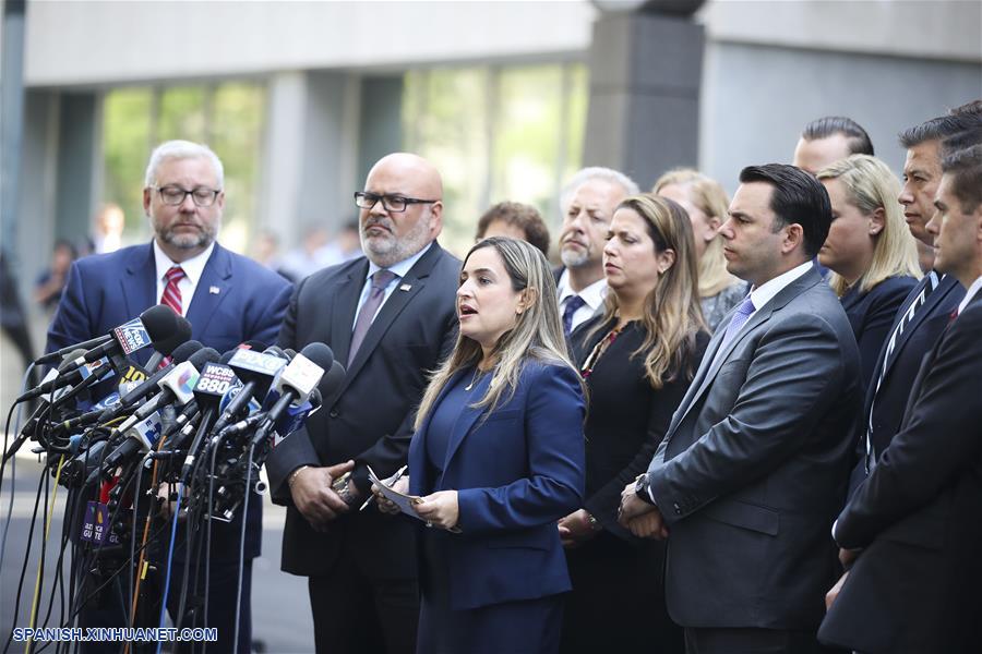 NUEVA YORK, 17 julio, 2019 (Xinhua) -- Ariana Fajardo Orshan (c), abogada de Estados Unidos para el Distrito Sur de Florida, ofrece una declaración luego de que se conciera la sentencia de Joaquín "El Chapo" Guzmán, frente a una corte federal en el barrio de Brooklyn de la Ciudad de Nueva York, Estados Unidos, el 17 de julio de 2019. Jueces de Estados Unidos sentenciaron el miércoles a cadena perpetua al capo mexicano de la droga, Joaquín "El Chapo" Guzmán. El juez de distrito, Brian Cogan, anunció el veredicto en un tribunal federal del distrito de Brooklyn, Nueva York. Cogan también a?adió 30 a?os a la condena y ordenó a Guzmán pagar 12.600 millones de dólares al gobierno estadounidense. (Xinhua/Wang Ying)