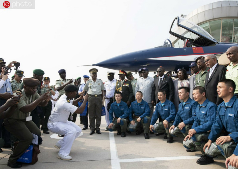 Beijing, 19/07/2019 (El Pueblo en Línea) -Un representante africano se fotografía con dos pilotos de combate J-10 del Equipo de Acrobacias Aéreas de Bayi, adscrito a las Fuerza Aérea del Ejército Popular de Liberación de China, realizaron una exhibición este martes 16 de julio del 2019 durante el primer Foro de Paz y Seguridad China-áfrica, que se celebra en Beijing. El magno encuentro se inauguró este lunes y sesionará hasta el próximo sábado.[Foto: People.cn]