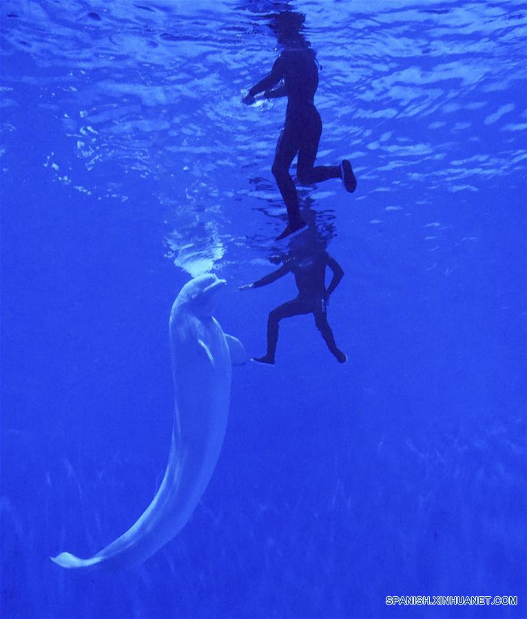 QINGHAI, 19 julio, 2019 (Xinhua) -- Imagen del 18 de julio de 2019 de cuidadores interactuando con una ballena beluga en un acuario en Xining, en la provincia de Qinghai, en el noroeste de China. El acuario más alto del mundo abrió para operación de prueba en la provincia de Qinghai, en el noroeste de China, el jueves. A una altitud de más de 2.200 metros sobre el nivel del mar, el nuevo acuario está ubicado en la ciudad de Xining, capital de Qinghai, siendo el primer acuario en la meseta de Qinghai-Tibet. (Xinhua/Wang Bo)