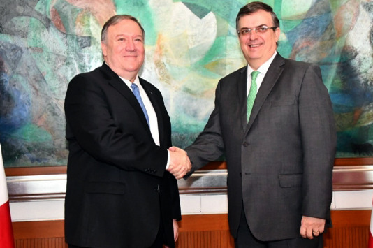 El secretario de Relaciones Exteriores de México, Marcelo Ebrard (d), estrecha la mano con el secretario de Estado de Estados Unidos, Mike Pompeo (i), durante su reunión en la Ciudad de México, capital de México, el 21 de julio de 2019. El gobierno de México no ve necesario iniciar negociaciones con Estados Unidos por un eventual acuerdo de "tercer país seguro", ante los avances logrados en materia migratoria, consideró el domingo la cancillería mexicana. (Xinhua/Str)