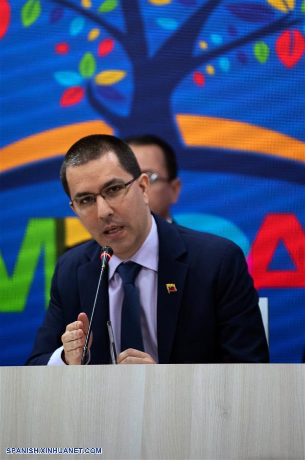 El ministro de Relaciones Exteriores de Venezuela, Jorge Arreaza, habla durante una reunión del Grupo de Países Amigos en defensa de la Carta de Naciones Unidas, en Caracas, Venezuela, el 21 de julio de 2019. El Grupo de Países Amigos en defensa de la Carta de Naciones Unidas acordó el domingo en Caracas una declaración a favor del diálogo en Venezuela y contra las medidas coercitivas. (Xinhua/Marcos Salgado)