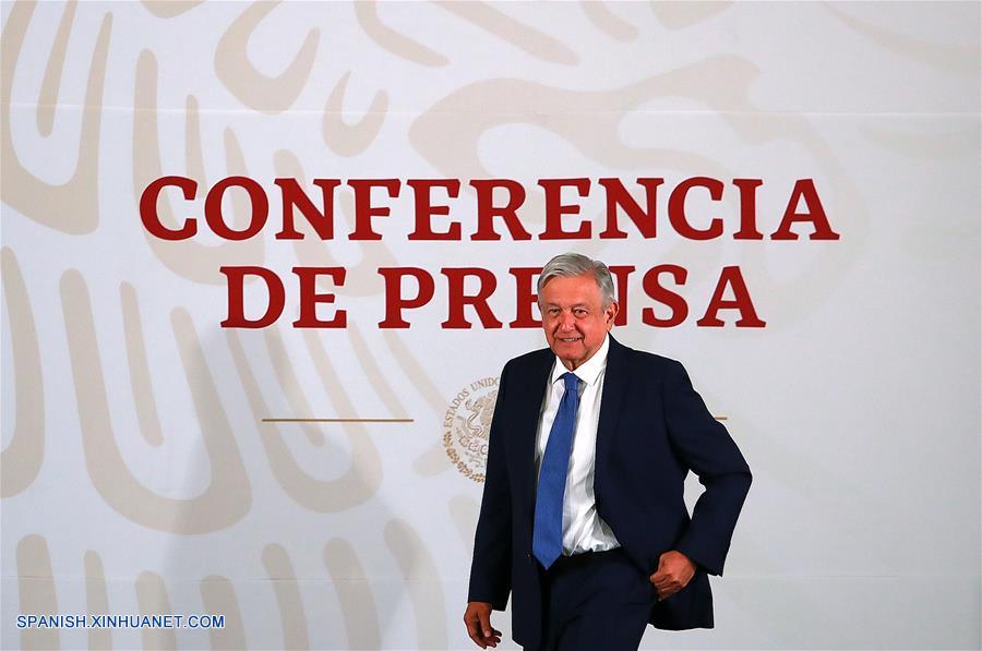 El presidente de México, Andrés Manuel López Obrador, asiste a una rueda de prensa en Palacio Nacional, en la Ciudad de México, capital de México, el 23 de julio de 2019. López Obrador, dijo el martes que el país no renunciará a organismos como el Fondo Monetario Internacional (FMI) pese a las discrepancias sobre la forma de medir el crecimiento económico. (Xinhua/Str)