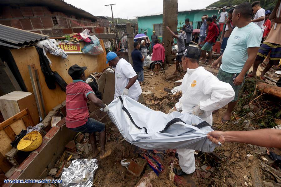 Imagen proveída por Agencia Estado de rescatistas trasladando un cuerpo en la zona donde se registró un deslizamiento de tierras a causa de las lluvias, en Olinda, estado de Pernambuco, Brasil, el 24 de julio de 2019. Al menos 13 personas fallecieron en las últimas horas a consecuencia de las intensas lluvias en la zona de Recife, capital del estado brasile?o de Pernambuco, informó el miércoles el Cuerpo de Bomberos local. (Xinhua/Carlos Ezequiel Vannoni/Agencia Pixel Press/AGENCIA ESTADO)