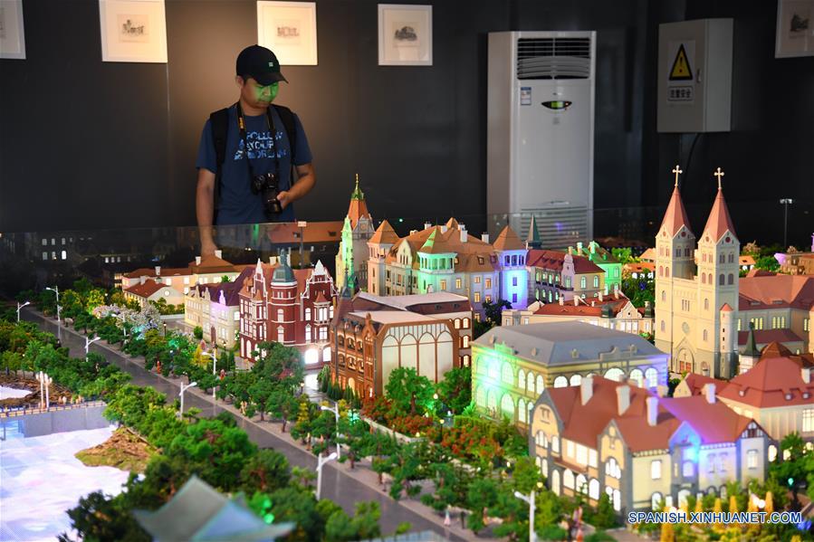 SHANDONG, 28 julio, 2019 (Xinhua) -- Un hombre observa una maqueta de edificios antiguos durante una exposición en Qingdao, en la provincia de Shandong, en el este de China, el 28 de julio de 2019. Una exposición sobre las maquetas de los edificios antiguos en Qingdao se lleva a cabo en el Centro de Vela Internacional de Qingdao, durante la cual 60 maquetas son exhibidas para mostrar la historia y cultura de la ciudad costera. (Xinhua/Li Ziheng)