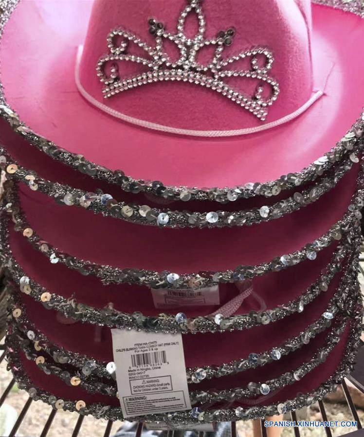 CHEYENNE, 27 julio, 2019 (Xinhua) -- Imagen del 24 de julio de 2019 de sombreros de vaquera hechos en China exhibidos en el evento Cheyenne Frontier Days, en Cheyenne, Estados Unidos. Cheyenne Frontier Days, el rodeo anual más importante del país de diez días de duración y uno de los espectáculos de estilo de vida más estadounidense, está repleto de regalos y artefactos hechos del otro lado del océano Pacífico. (Xinhua/Peter Mertz)