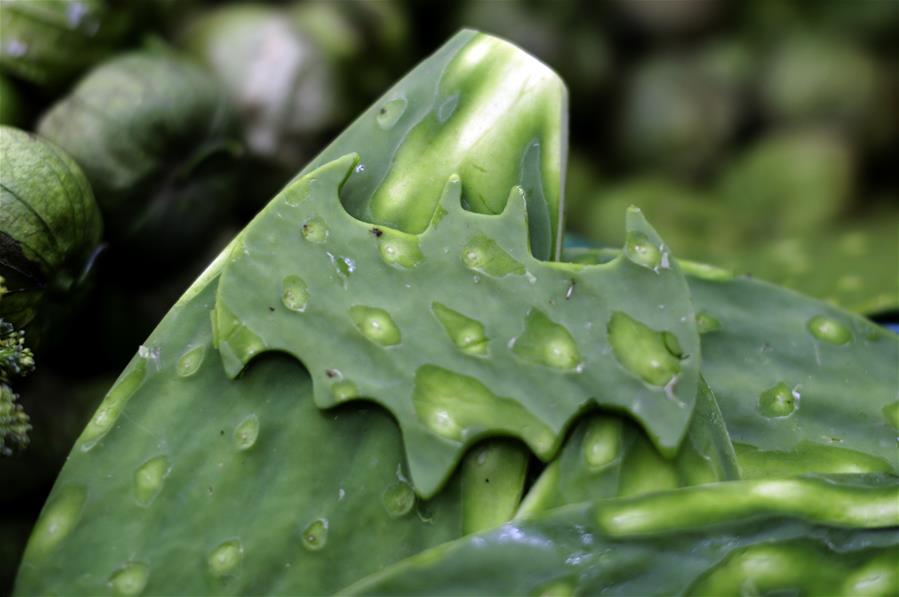 Imagen del 24 de julio de 2019 de una vista de un dise?o de nopal con la figura de Batman, creado por el comerciante de verduras y legumbres, inventor de los "batinopales", Juan Antonio Aguilar, durante una preparación de estos nopales en el mercado de La Bola ubicado en la alcaldía Coyoacán, en la Ciudad de México, capital de México. Para atraer a más clientes, Juan Antonio Aguilar, quien desde hace más de 20 a?os se dedica a la venta de verduras y legumbres en su puesto en el mercado de La Bola, tuvo la idea de vender los "batinopales", nopales con la figura de Batman, y otras figuras, que, sin imaginárselo se convertirían en una gran ayuda para que las madres incentiven a sus hijos a comer verduras y legumbres, de acuerdo con información de la prensa local. (Xinhua/Francisco Ca?edo)