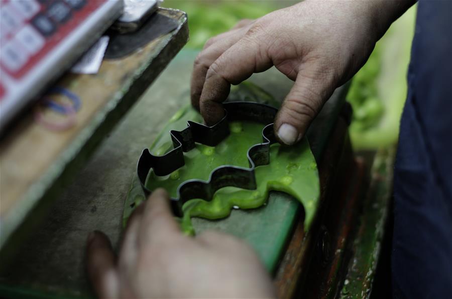 Imagen del 24 de julio de 2019 del comerciante de verduras y legumbres, inventor de los "batinopales", Juan Antonio Aguilar, elaborando un dise?o de nopal con la figura de Batman, durante una preparación de estos nopales en el mercado de La Bola ubicado en la alcaldía Coyoacán, en la Ciudad de México, capital de México. Para atraer a más clientes, Juan Antonio Aguilar, quien desde hace más de 20 a?os se dedica a la venta de verduras y legumbres en su puesto en el mercado de La Bola, tuvo la idea de vender los "batinopales", nopales con la figura de Batman, y otras figuras, que, sin imaginárselo se convertirían en una gran ayuda para que las madres incentiven a sus hijos a comer verduras y legumbres, de acuerdo con información de la prensa local. (Xinhua/Francisco Ca?edo)