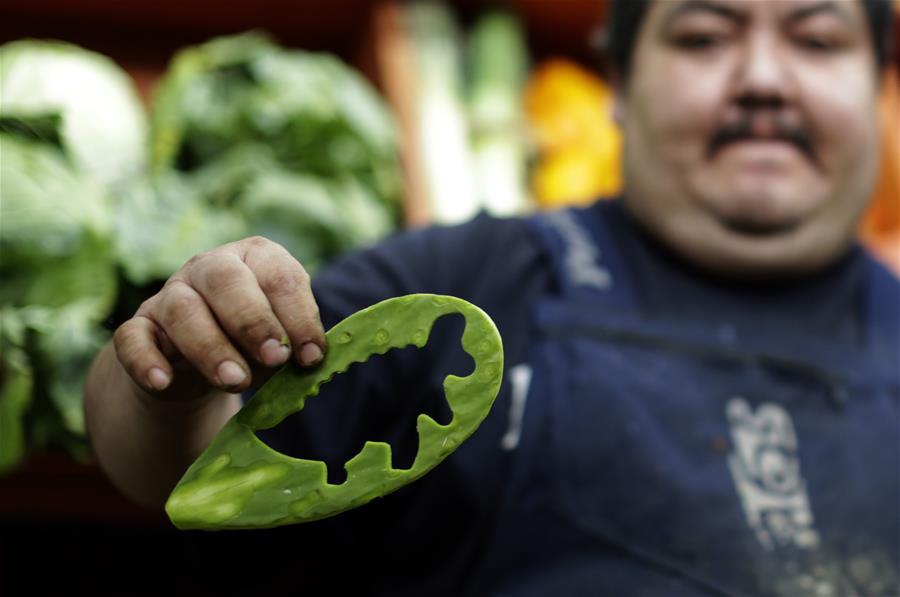 Imagen del 24 de julio de 2019 del comerciante de verduras y legumbres, inventor de los "batinopales", Juan Antonio Aguilar, mostrando un dise?o de nopal con la figura de un animal, durante una preparación de estos nopales en el mercado de La Bola ubicado en la alcaldía Coyoacán, en la Ciudad de México, capital de México. Para atraer a más clientes, Juan Antonio Aguilar, quien desde hace más de 20 a?os se dedica a la venta de verduras y legumbres en su puesto en el mercado de La Bola, tuvo la idea de vender los "batinopales", nopales con la figura de Batman, y otras figuras, que, sin imaginárselo se convertirían en una gran ayuda para que las madres incentiven a sus hijos a comer verduras y legumbres, de acuerdo con información de la prensa local. (Xinhua/Francisco Ca?edo)