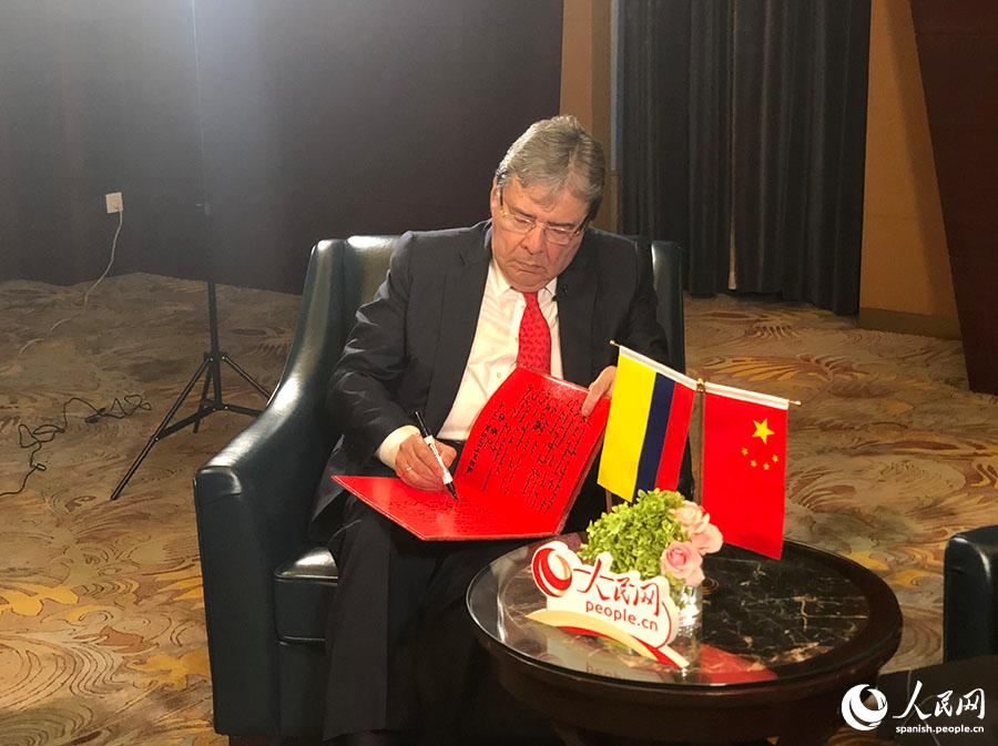 El ministro de Relaciones Exteriores de Colombia, Carlos Holmes Trujillo García, firmó para el Diario del Pueblo en Línea, el 30 de julio de 2019. (Foto: Zhao Jian/Pueblo en Línea)