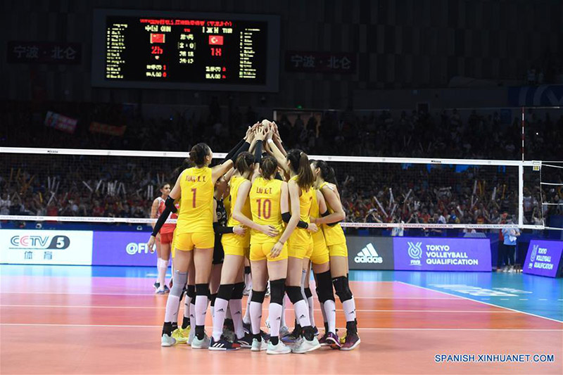 ZHEJIANG, 4 agosto, 2019 (Xinhua) -- Jugadoras de China, festejan luego del partido del Grupo B de la Clasificación Olímpica femenil para Tokio de la Federación Internacional de Voleibol (FIVB) 2019, ante Turquía, en Ningbo, provincia de Zhejiang, en el este de China, el 4 de agosto de 2019. (Xinhua/Huang Zongzhi)