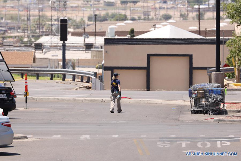 EL PASO , agosto 4, 2019 (Xinhua) -- Un agente del Buró Federal de Investigaciones (FBI, por sus siglas en inglés) labora en la escena de un tiroteo en un Walmart, en El Paso, estado de Texas, Estados Unidos, el 4 de agosto de 2019. Un tiroteo mató el sábado al menos a 20 personas e hirió a otras 26 en la ciudad de El Paso del estado de Texas, EEUU, dijeron funcionarios locales en una conferencia de prensa. El sospechoso, detenido, fue identificado como un hombre blanco de 21 a?os oriundo de Texas, según el jefe de la policía del estado, Greg Allen. (Xinhua/Liu Liwei)