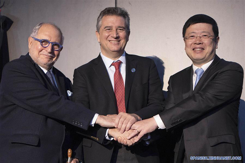 Imagen del 2 de agosto de 2019 del ministro argentino de Agricultura, Ganadería y Pesca, Luis Miguel Etchevehere (c), el embajador chino en Argentina, Zou Xiaoli (d) y el embajador de Argentina en China, Diego Guelar (i), estrechan sus manos durante el panel "Panorama relación comercial Argentina-China. Una relación estratégica de largo plazo" en el marco de la Exposición Rural 2019, en Buenos Aires, Argentina. Argentina destaca el carácter estratégico de la relación comercial con China en materia de agroindustria, afianzada con la firma de nueve protocolos sanitarios en el último a?o y medio. (Xinhua/Martín Zabala)