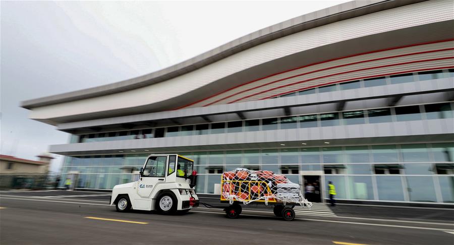 CHONGQING, 8 agosto, 2019 (Xinhua) -- Imagen del 16 de julio de 2019 de un transportista de equipaje del aeropuerto entregando el equipaje durante una operación de prueba en el Aeropuerto de Wushan, en la municipalidad de Chongqing, en el suroeste de China. Bautizado como un aeropuerto "alto en las nubes", el Aeropuerto de Wushan en Chongqing cumplió el miércoles con los estándares de la industria y se espera que comience operaciones a mediados de agosto. (Xinhua/Chongqing Airport Group)