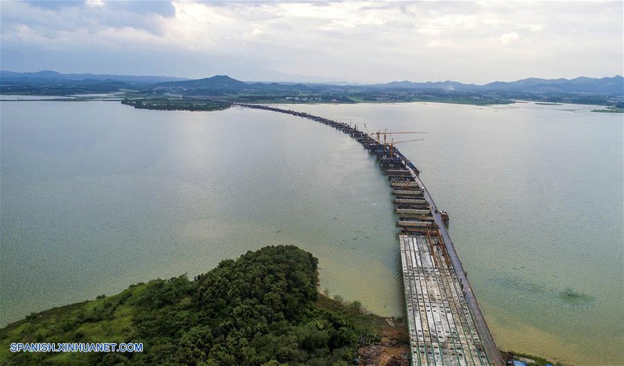 JIANGXI, 11 agosto, 2019 (Xinhua) -- Imagen aérea del 10 de agosto de 2019 del sitio de construcción del Gran Puente del Lago Xinmiao en el condado de Duchang de Jiujiang, en la provincia de Jiangxi, en el este de China. El Gran Puente del Lago Xinmiao bajo construcción está dise?ado para tener 2.292,5 metros de largo con seis carriles. Una vez terminado, el puente desempe?ará un importante papel en la mejora del transporte regional y la promoción del turismo. (Xinhua/Yang Wenbin)