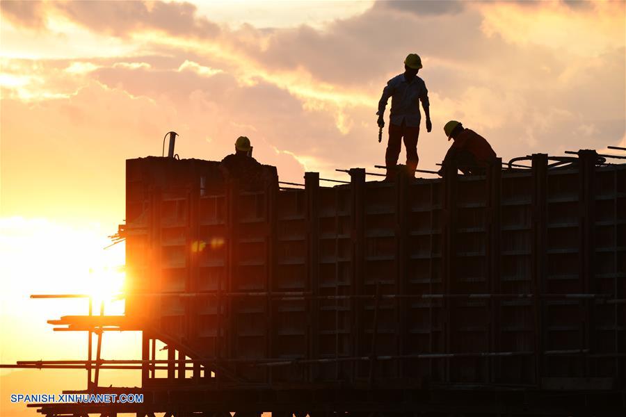 JIANGXI, 11 agosto, 2019 (Xinhua) -- Imagen del 10 de agosto de 2019 de trabajadores laborando en el sitio de construcción del Gran Puente del Lago Xinmiao en el condado de Duchang de Jiujiang, en la provincia de Jiangxi, en el este de China. El Gran Puente del Lago Xinmiao bajo construcción está dise?ado para tener 2.292,5 metros de largo con seis carriles. Una vez terminado, el puente desempe?ará un importante papel en la mejora del transporte regional y la promoción del turismo. (Xinhua/Yang Wenbin)