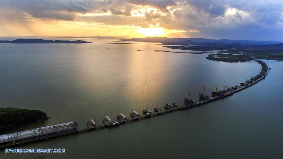 JIANGXI, 11 agosto, 2019 (Xinhua) -- Imagen aérea del 10 de agosto de 2019 del sitio de construcción del Gran Puente del Lago Xinmiao en el condado de Duchang de Jiujiang, en la provincia de Jiangxi, en el este de China. El Gran Puente del Lago Xinmiao bajo construcción está dise?ado para tener 2.292,5 metros de largo con seis carriles. Una vez terminado, el puente desempe?ará un importante papel en la mejora del transporte regional y la promoción del turismo. (Xinhua/Yang Wenbin)