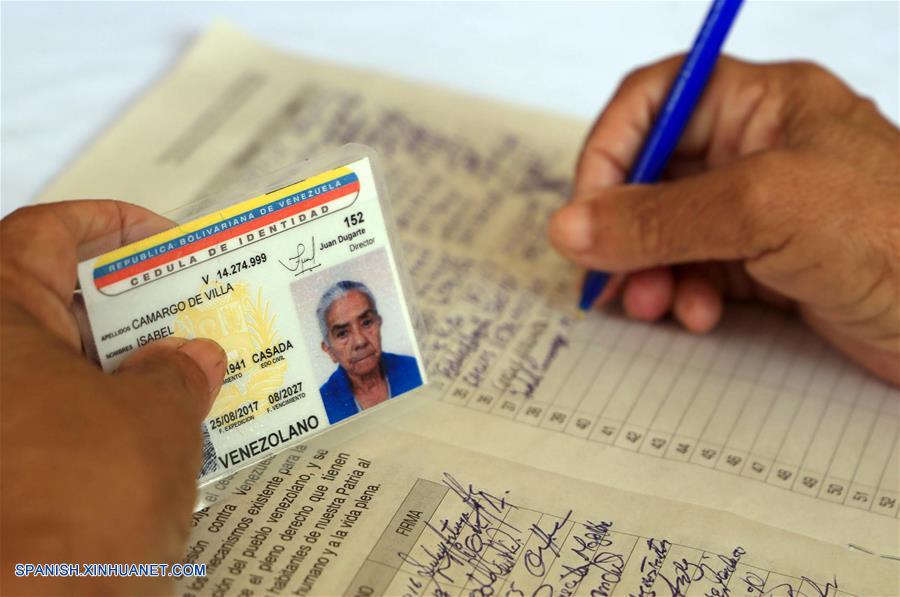 Una persona muestra su cédula de identidad mientras firma durante la jornada mundial de protesta "No más Trump", en la Plaza Bolívar de Caracas, Venezuela, el 11 de agosto de 2019. La jornada mundial de protesta "No más Trump" continúa el domingo en las distintas plazas de Venezuela, en rechazo al bloqueo del gobierno de Estados Unidos y se extenderá a todos los rincones, informó el constituyente Darío Vivas. (Xinhua/Str)