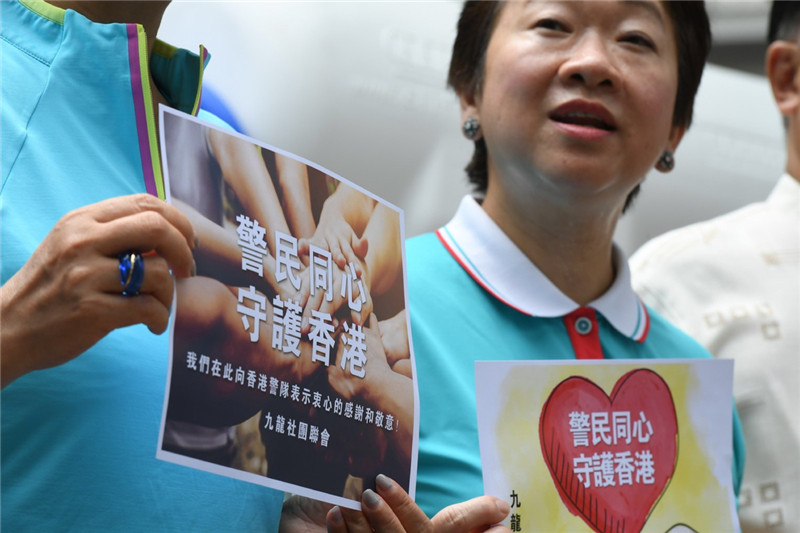 Los residentes entregan una tarjeta de felicitación a un policía de la estación Kwun Tong, Hong Kong, 10 de agosto del 2019. [Foto: Xinhua]
