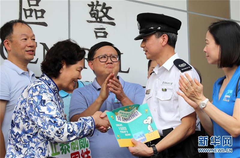 Los residentes locales entregan una tarjeta de felicitación a un policía en la Estación Central de Policía, Hong Kong, el 10 de agosto de 2019. [Foto: Xinhua]