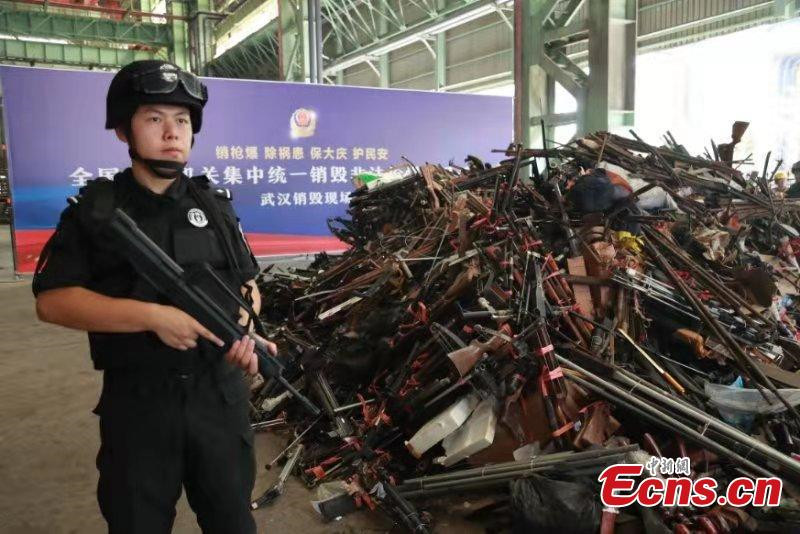 Un policía hace guardia cerca de un centenar de armas que serán destruidas en la ciudad de Wuhan, provincia de Hubei, 12 de agosto del 2019. El Ministerio de Seguridad Pública de China organizó un evento simultáneo en 154 ciudades –en Wuhan se celebró el acto central- para destruir un total de 107.000 armas, explosivos y detonadores incautados a partir del a?o pasado gracias a los operativos que buscan aumentar la seguridad ciudadana. [Foto: China News Service/Zhang Ziyang]