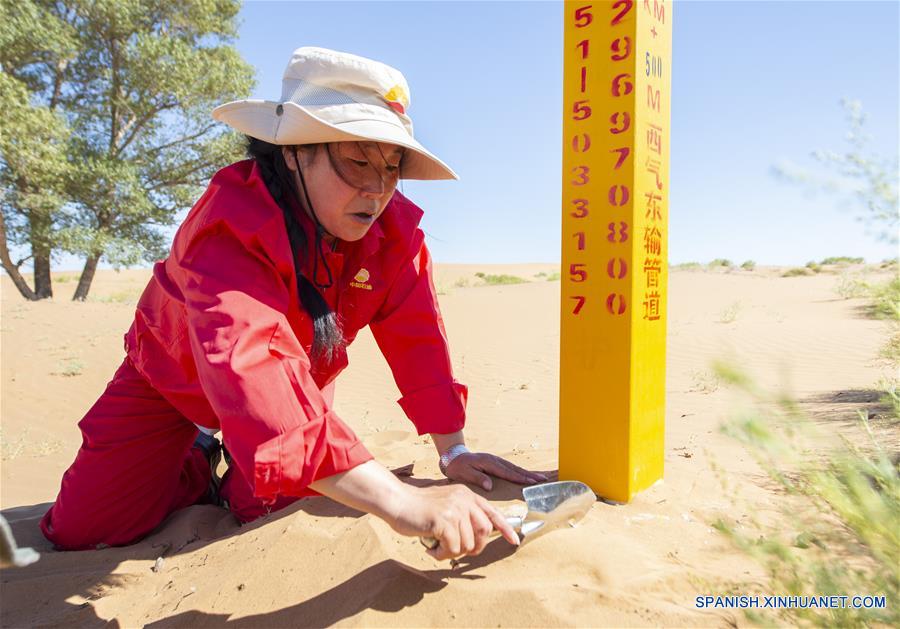 ARAXAN, 13 agosto, 2019 (Xinhua) -- Imagen del 11 de agosto de 2019 de Tao Xihua, realizando trabajos de mantenimiento en una instalación en las zonas desérticas de la Bandera Izquierda de Araxan, en la Región Autónoma de Mongolia Interior, en el norte de China. Tao Xihua, una pastora de 44 a?os de edad, comenzó un trabajo de medio tiempo para patrullar a lo largo de una sección de la tubería del proyecto de transmisión de gas natural Oeste-Este, desde el a?o 2007. Ella y su esposo, quien también es un empleado del patrullaje se encargan de tubos de 10 kilómetros de longitud por separado. En los últimos diez a?os, ella patrulla concienzudamente los tubos por más de tres horas en un día en las zonas desérticas. Un total de 67 kilómetros de tubería fueron colocados en las zonas desérticas y cerca de tres millones de personas se benefician por la sucursal. (Xinhua/Yang Zhisen)