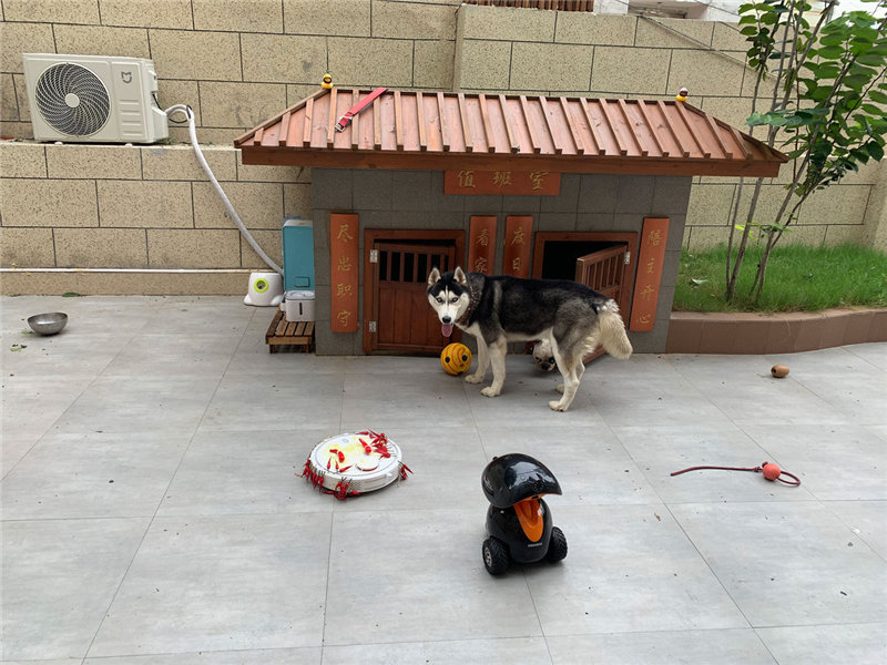 Un husky se encuentra frente a su casa de estilo chino, junto a un un robot aspiradora y un robot mucamo. [Foto: proporcionada a Chinadaily]