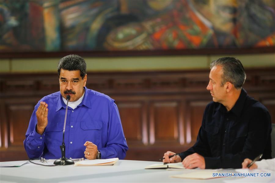 (190814) -- CARACAS, 14 agosto, 2019 (Xinhua) -- Imagen cedida por la Presidencia de Venezuela, del presidente venezolano, Nicolás Maduro (i), hablando en una jornada de trabajo enfocada en la producción nacional emitida desde el Palacio de Miraflores, en Caracas, Venezuela, el 14 de agosto de 2019. Maduro anunció el miércoles la creación de una fundación para capacitar y fortalecer el sector agroalimentario de su país. (Xinhua/Presidencia de Venezuela)