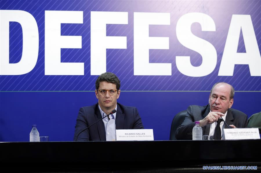 El ministro de Medio Ambiente brasiele?o, Ricardo Salles (i), y el ministro de Defensa, Fernando Azevedo e Silva (d), asisten a una rueda de prensa, en Brasilia, Brasil, el 24 de agosto de 2019. El gobierno de Brasil ofreció ayuda federal a los gobiernos de la región amazónica para combatir el fuego y puso a su disposición las Fuerzas Armadas para combatir los incendios, que han levantado una gran polémica internacional. (Xinhua/Lucio Tavora)