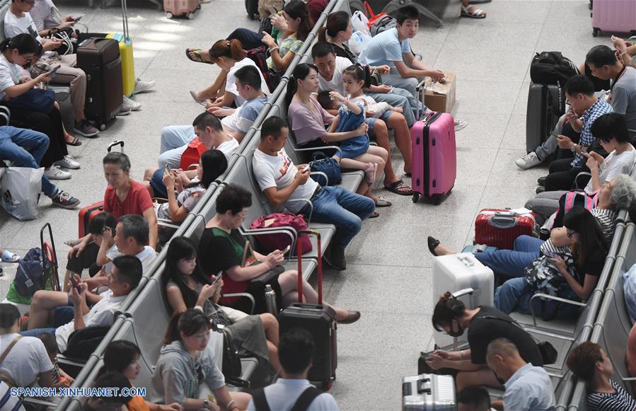 FUJIAN, 27 agosto, 2019 (Xinhua) -- Pasajeros esperan los trenes en la Estación del Ferrocarril de Fuzhou, en la provincia de Fujian, en el sureste de China, el 27 de agosto de 2019. El sistema ferroviario ha sido testigo de una oleada de viajes recientemente ya que la temporada alta del "transporte de verano" de este a?o llegará a su fin el 31 de agosto. (Xinhua/Song Weiwei)